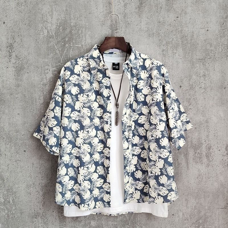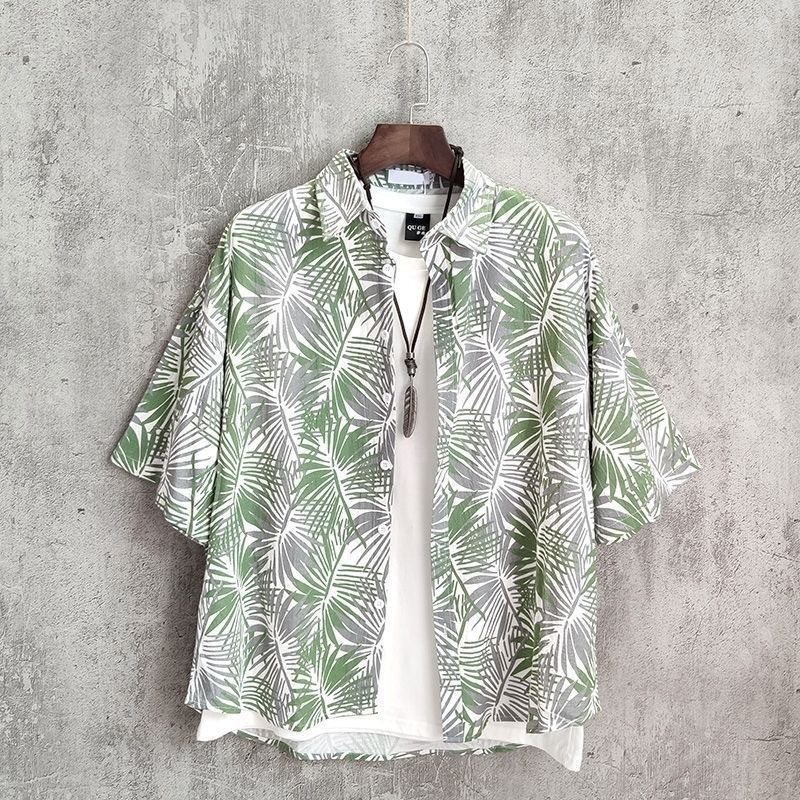 Hong Kong style short-sleeved shirt for men and women couples summer loose thin Hawaiian sand shirt